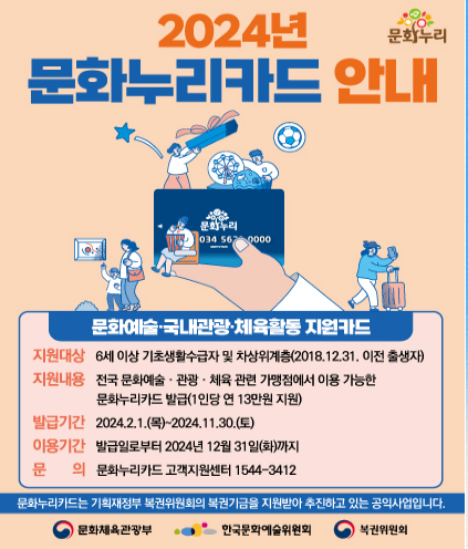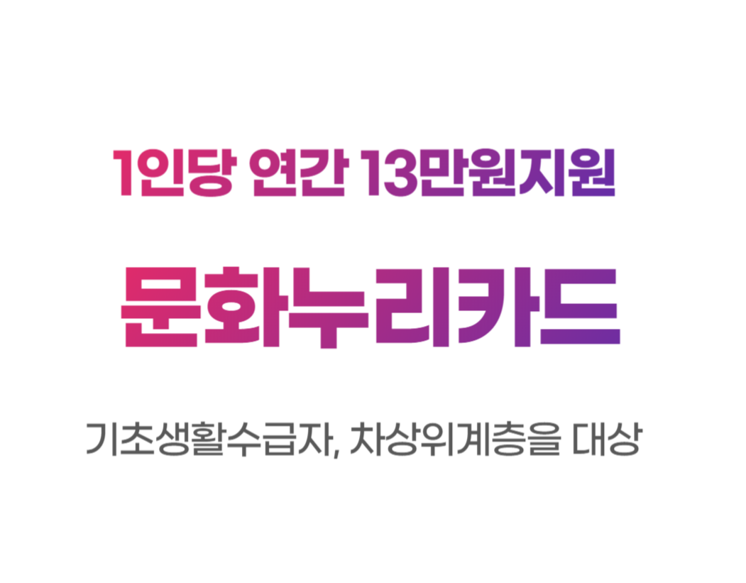문화누리카드는 삶의 질 향상과 문화격차 완화를 위해 문화예술, 국내여행, 체육활동을 지원하는 카드로 기초생활수급자 및 차상위계층을 대상으로 합니다.