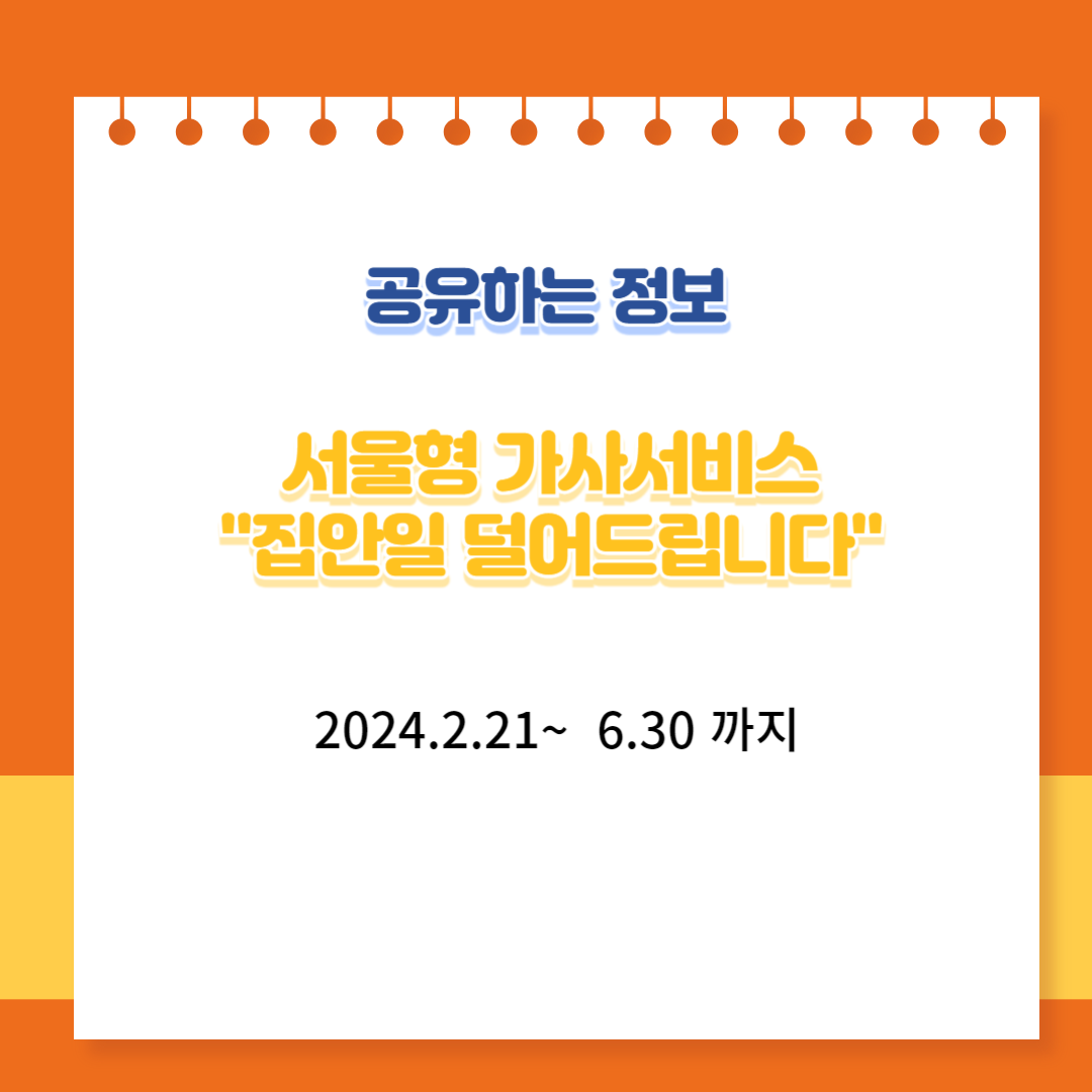 ▶신청방법 : '서울시 가족센터 누리집'과 '서울형 가사서비스 누리집'에서 신청할 수 있으며, 지원내용과 신청자격, 유형별 구비서류는 서울누리집 →고시공고를 통해 확인할 수 있습니다.