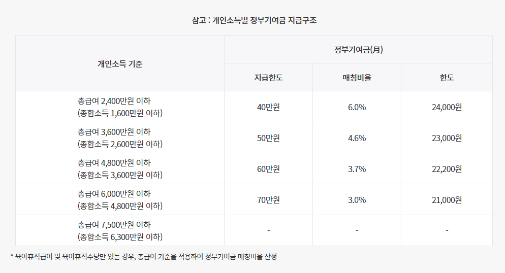 →육아휴직급여(육아휴직수당 포함) 및 군장병급여만 있는 경우, 정부기여금 매칭 비율 6%적용