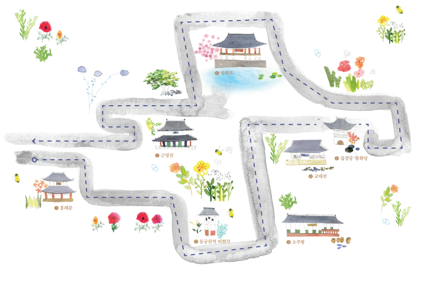 입장(흥례문 개문의식 및 동궁권역 탐방 )→외소주방(궁중음식 체험 및 국악공연 관람) →  야간탐방(교태전, 집경당·함화당, 경회루, 근정전 관람)
