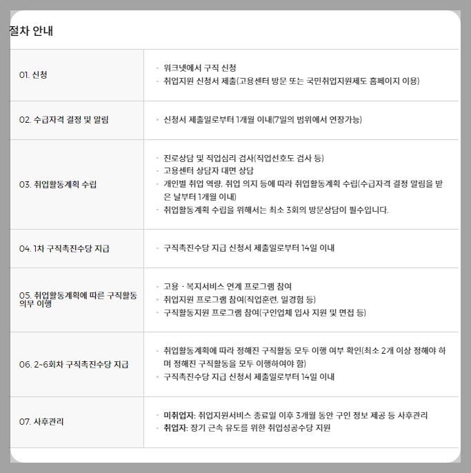 국민취업지원제도 사이트 신청 → 수급자격 결정 및 알림 →취업활동계획 수립 →1차 구직촉진수당지급 →취업활동계획에 따른 구직활동 의무 이행→2~6차 구직촉진수당 지급 →사후관리